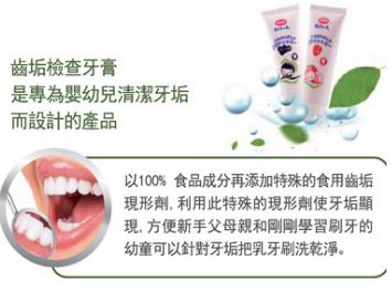 齒垢檢查牙膏是專為嬰幼兒清潔牙垢而設計的產品, 以食品成分再添加特殊的食用齒垢現形劑,利用此特殊的現形劑使牙垢顯現,方便新手父母親和剛剛學習刷牙的幼童可以針對牙垢把乳牙刷洗乾淨。
